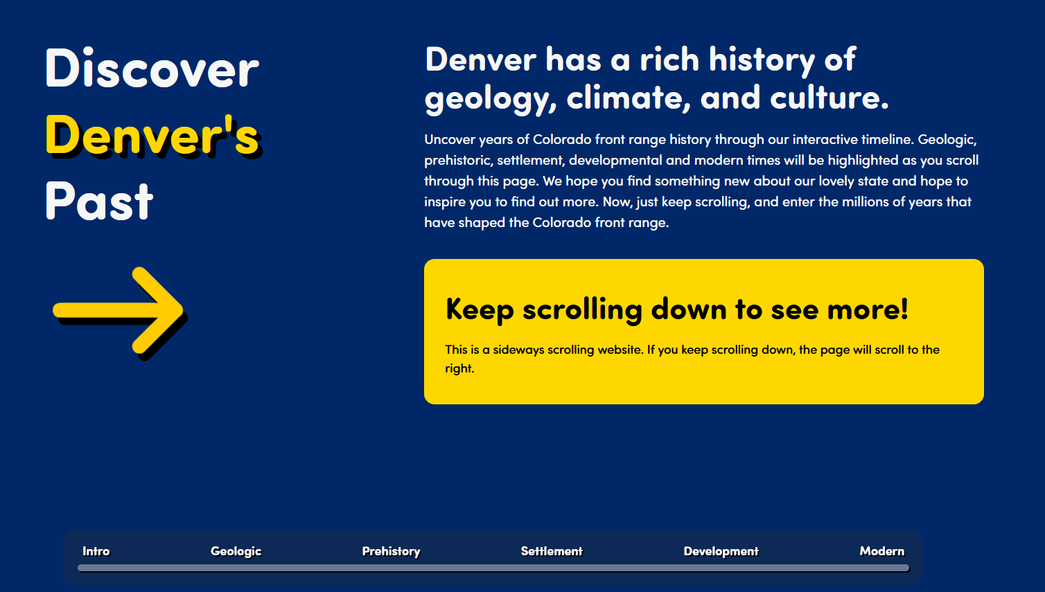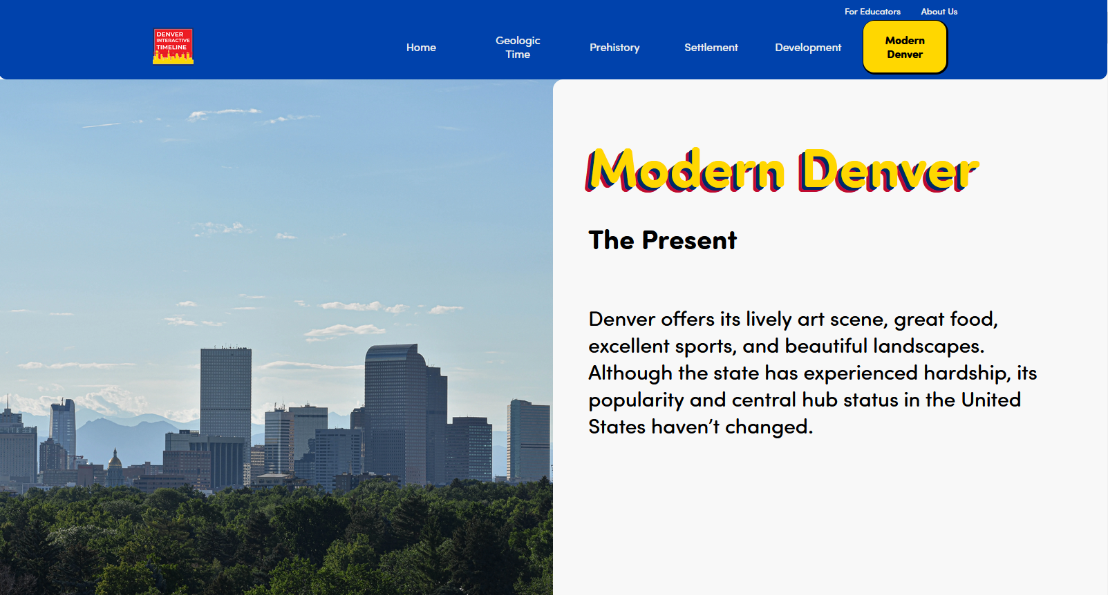 The most important creative goal of the Denver Interactive Timeline was serving users first. This meant that intentional design decisions focused around readability and accessibility to young learners were extremely important to how the website was going to be structured.